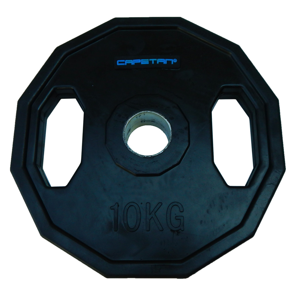 Capetan® 10 kg gummiüberzogene Olympiascheibe, zwei Griffen, mit eckigem rollhemmendem Rand, mit 51 mm Lochdurchmesser – gummierte Hantelscheibe Details