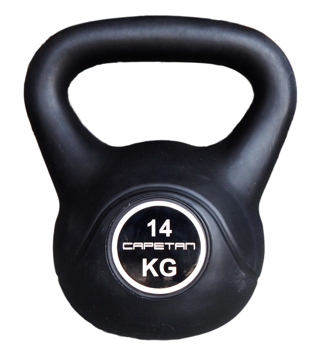 Capetan® 14 kg Kettlebell aus Kunststoff - Kugelhantel mit Zement Füllung, mit Kunststoff Überzug. Dank des äußeren Überzugs wird der Boden mehr geschont als die Produkte aus Metall. Sie ist langlebig aber der Lebensdauer ist kürzer als der der Kugelhantel aus Metall. Kettlebells aus Kunststoff sind gewöhnlich größer als die aus Metall. Das vielerlei benannte Fitness-Gerät ist in schwarzer Farbe erhältlich. Sie ist für aerob und anaerob Leistugseffekte beim Workout geeignet. Während des Trainings mit Kettlebell werden permanente Koordination, Konzentration, und schwere Kraftaufwand gefördert. Gekräftigt werden die folgenden Muskel-Ketten: Schultern, Rücken, Tiefenmuskulatur, Hüftmuskulatur, Bauchmuskulatur.