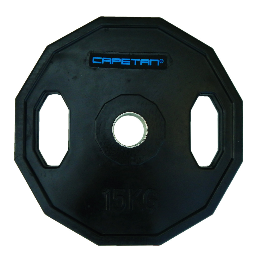 Capetan® 15 kg gummiüberzogene Olympiascheibe, zwei Griffen, mit eckigem rollhemmendem Rand, mit 51 mm Lochdurchmesser – gummierte Hantelscheibe Details
