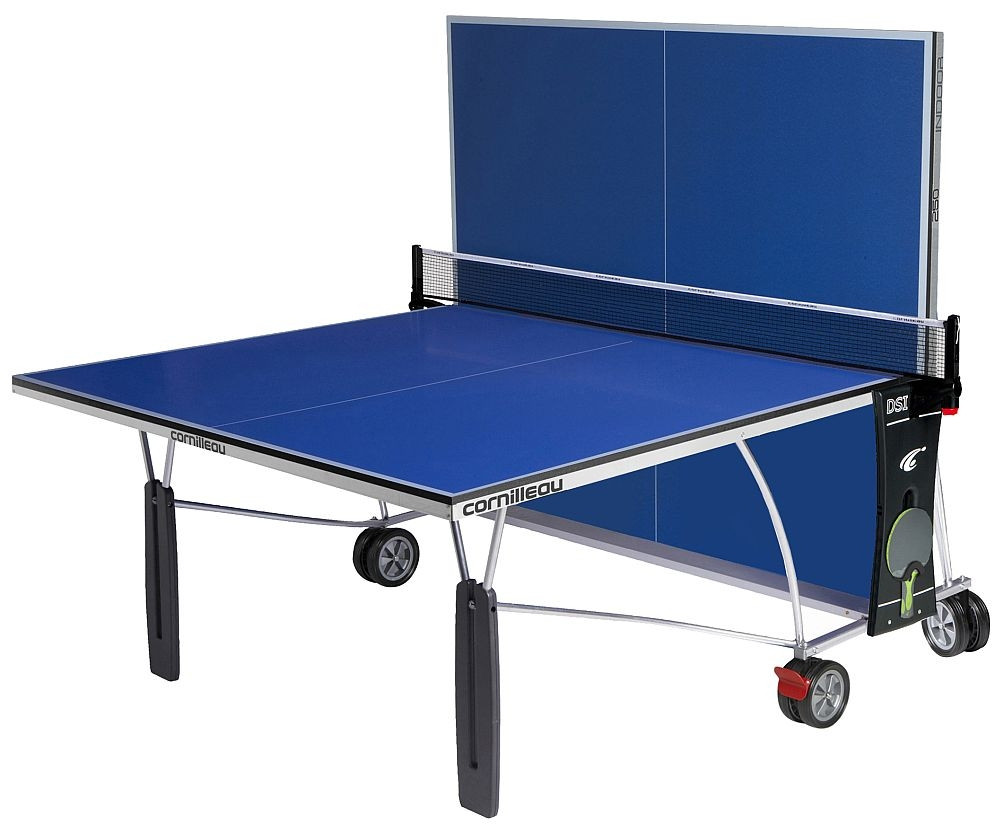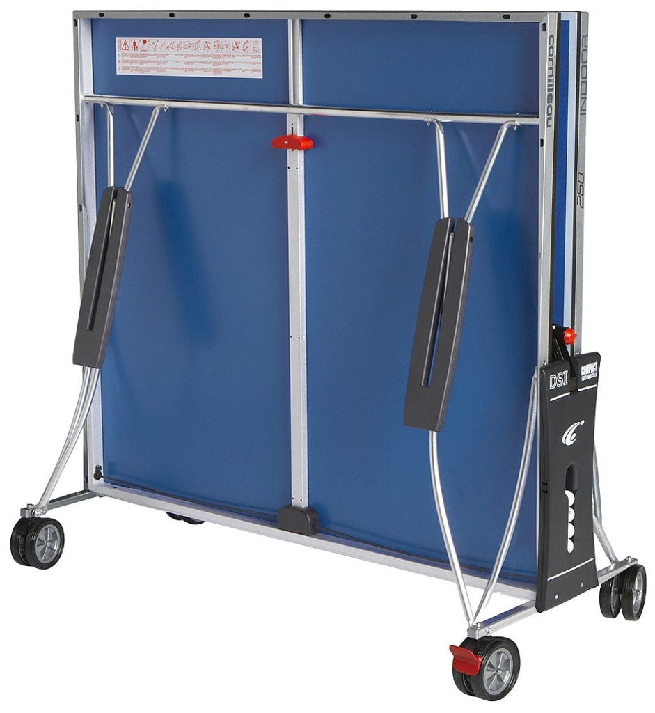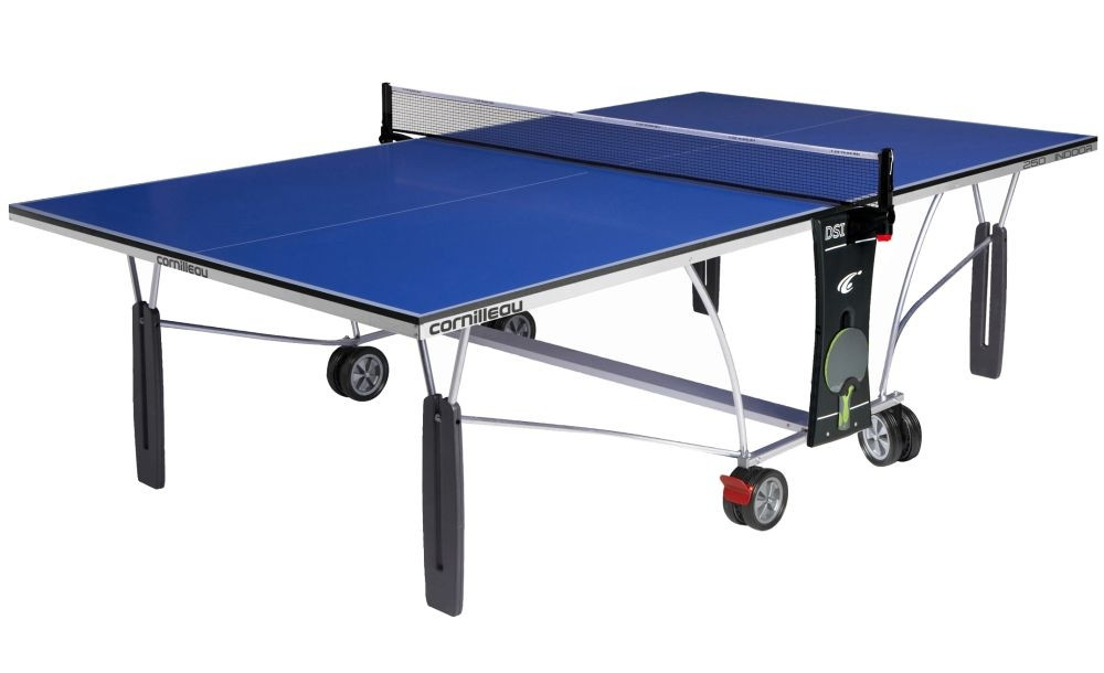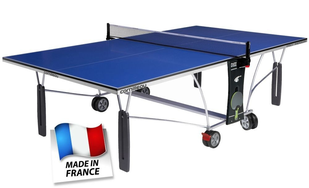 Cornilleau Sport 250 Indoor Tischtennisplatte ist eine Neuerscheinung des Jahres 2012, das Produkt erhielt den Sonderpreis von FFTT (Französische Tischtennisföderation) für optimales Preis-Leistungs-Verhältnis. Der Tisch vereinbart die günstigen Eigenschaften der robusten Tischtennisplatten mit dem filigranen Aussehen der billigeren Kategorien. Inkl. Lieferung innerhalb Deutschlands, 3 Jahre Garantie Der Cornilleau Sport 250 Indoor ist die geeignete Indoor Tischtennisplatte für ambitionierte Hobbyspieler.Besonders zu empfehlen für Familien mit Kindern. Das patentierte DSI Sicherheitssystem (auf 16 Punkten schließendes Schutzsystem, das im Falle eines Gefahrs schliesst sich bei einer Neigung von 45 Grad zurück) erlaubt auch Kindern den Tisch gefahrlos auf- und abzubauen.Die 19mm starke Plattenoberfläche mit einer Spezialbeschichtung sorgt für einen gleichmäßigen und guten Ballabsprung. Abgebaut hat der Cornilleau Sport 250 Indoor nur die Maße von Länge 161cm x Breite 75cm x Höhe 156cm, natürlich kann auch nur eine Plattenhälfte hochgeklappt werden.Cornilleau extra: 60 Jahre professionelle Erfahrung, innovative Marke auf den Märkten von Westeuropa, alle Bestandteilen hergestellt in Frankreich, min. 10 Jahre Ersatzteilversorgung nach dem Auslauf der einzelnen Modelle, 25 Jahre Rennerfahrung, Know-how geschützt: MAT TOP, DSI, Compact Technologie; MAT TOP: Die Oberfläche des Tisches wird mit einer Technologie ausgeführt, die die Reflexion völlig behindert. Im Vergleich zu anderen Tischen spiegelt die spezielle Beschichtung 10 Prozent weniger Licht zurück. Produkteigenschften:19 mm starke Tischtennisplatten mit guten RücksprungeigenschaftenPlatte mit verstärktem Rahmen von 30 mm4 lenkbare Doppelrollen (15 cm) am TischtennistischStabiler sicherer DSI Klappmechanismus, ergonomische Ausführung: zentrales Auslösungssystemdie Lieferung dieser Tischtennistische erfolgt inkl. NetzgarniturTischtennisplatte nach EN 14468-1 Klasse B (geeignet für Freizeitheimbereich und Schul- und Vereinssport)Aufstellmaße (LxBxH): 274x152,5x76 cm, gemäß der ITTF-Vorschrift (Internationale Tischtennisföderation)Abstellmaß LxBxH 161x75x156cm, Lieferumfang: 160 x 145 x 12 cmGewicht: 76 kgFarbe: blau