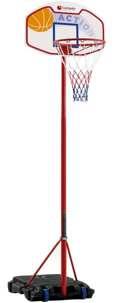 Garlando El Paso mit Sand oder Wasser füllbarer, rollbarer mobiler Streetballständer: Das Gerät ist eine höhenverstellbare Ausführung. Der Verstellungsbereich ist zwischen 160 und 210 cm. Das Ständer ist für Kinder und Teenager empfohlen. Das Haltegestell ist aus walzenförmigem Stahl gefertigt, der einen Durchmesser von 42 cm hat. Seine Oberfläche ist roter Anstrich mit Pulverlackierung. 2 Stck. Querhaltestangen sorgen für die adäquate Stabilität. Das Brett ist aus 22 mm dickem synthetischem Material gefertigt, seine Rückseite ist durch ein Gerippe verstärkt; für die geeignete Stabilität ist auch eine Metallversteifung an der Rückseite angebracht. Das Set enthält außerdem ein wetterfestes Netz aus Polypropylen; das Korb hat einen Durchmesser von 40 cm. Der Standfuß des Basketballständers ist mit Wasser oder Sand füllbar. An der Vorderseite hat es 2 Stck. Räder: diese helfen dabei, das Gerät nach dem Spiel abzustellen. Es entspricht allen EU-Sicherheitsnormen von EN 71. Größe des Brettes: 71 x 45 x 2,2 cm. Ausmaß des Standfußes: 77 x 55 x 13 cm.
