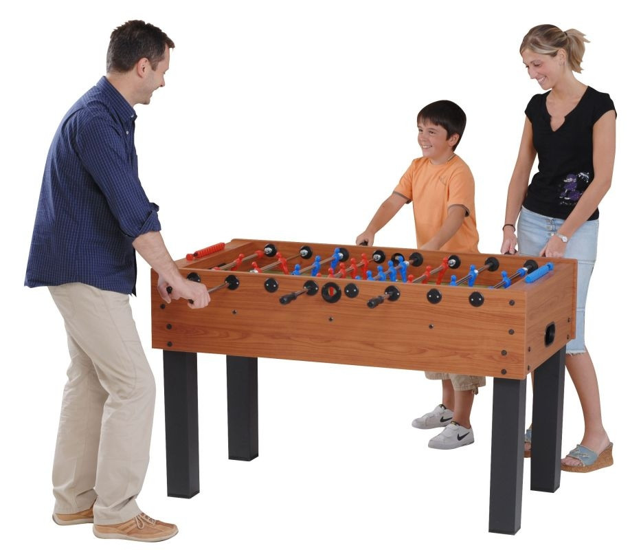 Garlando F-100 Giotto Fußballtisch: Ein halbprofessioneller Kickertisch hoher Qualität, ausdrücklich für Heimverwendung empfohlen. Er bietet einen reichhaltigen und unterhaltsamen Zeitvertreib für jüngere sowie ältere Familienmitglieder. Die Tischstruktur ist aus 16 mm dickem MDF-Stoff gefertigt, der durch eine Deckschicht aus Melamin widerstandsfähig gemacht ist. Auch mit neuem blauem Anstrich bestellbar neben der "Naturholz" Farbenvariante. Die Beine sind aus 30 mm dicken MDF-Platten, die ebenso durch eine Melamin-Deckschicht geschützt sind. Die Stangen sind aus 13 mm dickem, knackfestem Stahl gefertigt, mit korrosionsschützender Chromschicht bedeckt. Die Enden der Stangen sind für Sicherheit mit Plastik verschlossen. Farbige, völlig wirklichkeitsgetreue Figuren sind an sie geschraubt. Torwart-Figuren in 360-Grad-drehender Ausführung. Die laminierte Oberfläche des Spieltfeldes hat ein bisschen schiefe Ecken, also kommt der Ball während des Spieles seltener in einen toten Bereich. Bälle können durch die hinter den Toren angebrachten Ballhalter ausgenommen werden. Der Tisch wird mit 3 Stck. Standardbällen geliefert. Es gilt 2 Jahre Garantie auf den Kickertisch. Fußballtisch in Erwachenengröße: aufgrund seines größeren Gewichtes bietet der F-100 Kickertisch auch Erwachsenen ein stabiles, vergnügliches Spiel. Spielfeld aus 16 mm dicker MDF-Platte, mit grünem Anstrich der oberen Schicht Laminierte oberste Schicht auf dem Spielfeld Stahlstangen, mit Deckstöpseln an den Enden Um 360 Grad drehbare Torwart-Figuren Entspricht den europäischen CE Normen Es gilt 24 Monate Garantie auf das Produkt Größen: 145 x 66 x 88 cm Spielfeldmaß: 117 x 64 cm Packungsgröße: 130 x 71 x 28 cm Gewicht: 48 kg