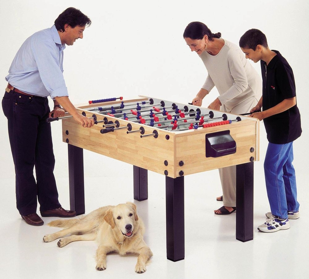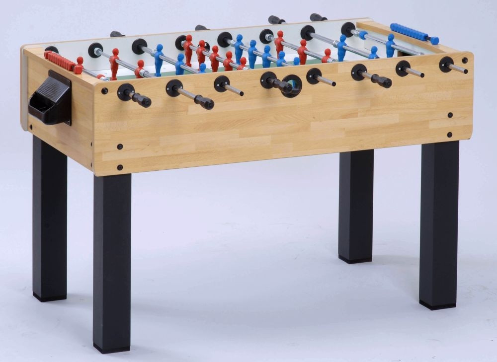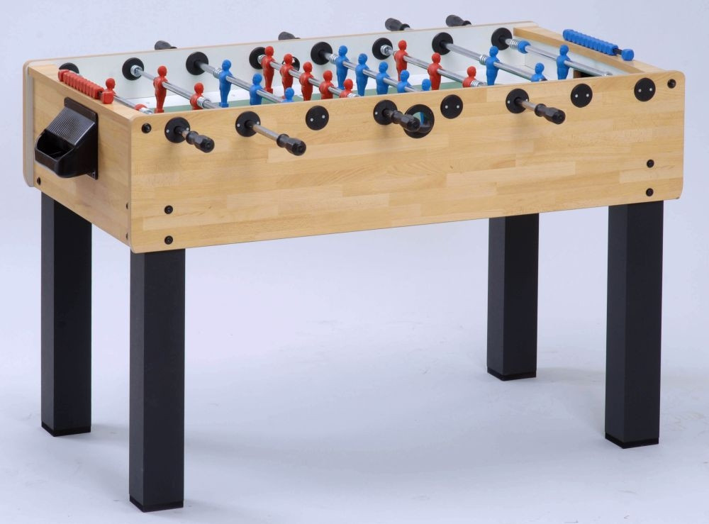 Garlando F-200 Maximus Fußballtisch: Einstiegsmodell der professionellen Kickertische in Wettkampfgröße, der die robuste Erscheinung mit der Qualität kombiniert, neben besonders günstigen Voraussetzungen. Aus 20 mm dicken MDF-Platten gebildetes Spielfeld, das über eine waschfeste sandgeblasene Glasdeckscheibe verfügt. Die Beine sind aus einem Material mit 9 x 9 cm Querschnitt gefertigt, und sie haben eine schwarze Melamin-Deckschicht. Der Spieltisch ist in Naturholzfarbe erhältlich; es gibt auch das F-200 Modell "Evolution", das ähnlich wie Wettkampf-Kicker eine schwarze Lackierung hat. Knackfeste Stahlstangen gehören zum Fußballtisch, die mit einer 15 Mikron dicken Schutzschicht aus Chrom gegen Verrostung versehen sind. Das Produkt ist optional auch mit Teleskopstangen zu bestellen. Die Kickerstangen laufen in Ringen mit Kugellagern. Als Spielfeld dient eine sandgeblasene gehärtete Glasscheibe mit einer nicht glänzenden Oberfläche. Körbe hinter beiden Toren für eine ganz leichte Ballentnahme. Torwart-Spielfiguren in 360-Grad-drehender Ausführung. Das Produkt wird mit 10 Stck. Standardbällen geliefert. Alle Oberflächen sind waschbar, wodurch die Reinigung erleichtert wird. Die gegen die Seitenwand stoßenden Spielfiguren springen davon mit Abdämpfung durch die Metallfedern an den Stangen zurück. Es gilt 2 Jahre Garantie auf das Produkt; das Inverkehrbringen ist nach den europäischen CE Normen zugelassen. Das Gerät entspricht den EU-Sicherheitsnormen EN 71-1, EN 71-2 und EN 71-3. Wenn es zu einem Kickertischkauf kommt, empfehlen wir diesen Tisch anspruchsvollen Kunden für Heimverwendung. Ein sandgeblasenes Glasspielfeld sowie die Stahlkugellagerung sorgen für das hochwertige Spielerlebnis. Ein "professioneller" Kickertisch in Wettkampfgröße: Aufgrund seiner Größen und seines Gewichts ist der Tisch eine beständige und starke Ausführung; all das ist aber mit elegantem Äußerem verbunden. Aus 20 mm dicken MDF-Platten gebildetes Spielfeld, das über eine waschfeste sandgeblasene Glasdeckscheibe verfügt. 9 x 9 cm dicke starke Beine mit Melaminschicht überzogen Stahlstangen, versehen mit 15 Mikron dicker Schutzschicht aus Chrom gegen Verrostung Optional auch mit Teleskopstangen bestellbar Körbe hinter beiden Toren für eine ganz leichte Ballentnahme Die Spielfeldoberfläche ist gehärtetes, nicht spiegelndes Glas Waschbare Oberflächen, die die Reinigung erleichtern Es gilt 24 Monate Garantie auf das Produkt Inverkehrbringen nach den europäischen CE Normen zugelassen Die dahin stoßenden Spielfiguren springen von der Seitenwand durch Metallfedern zurück.