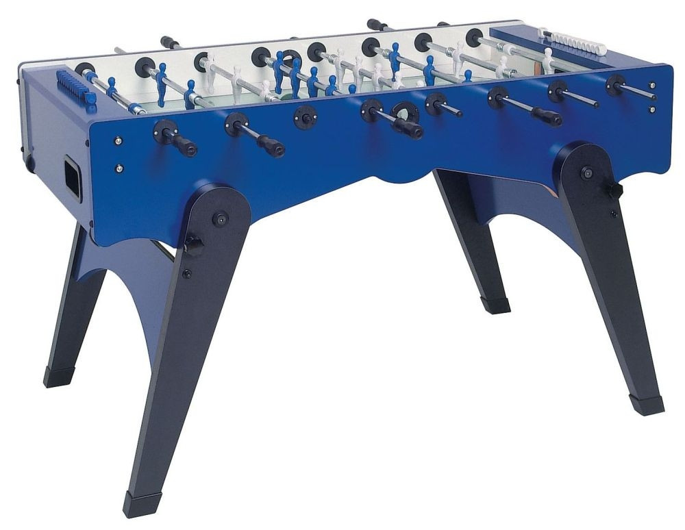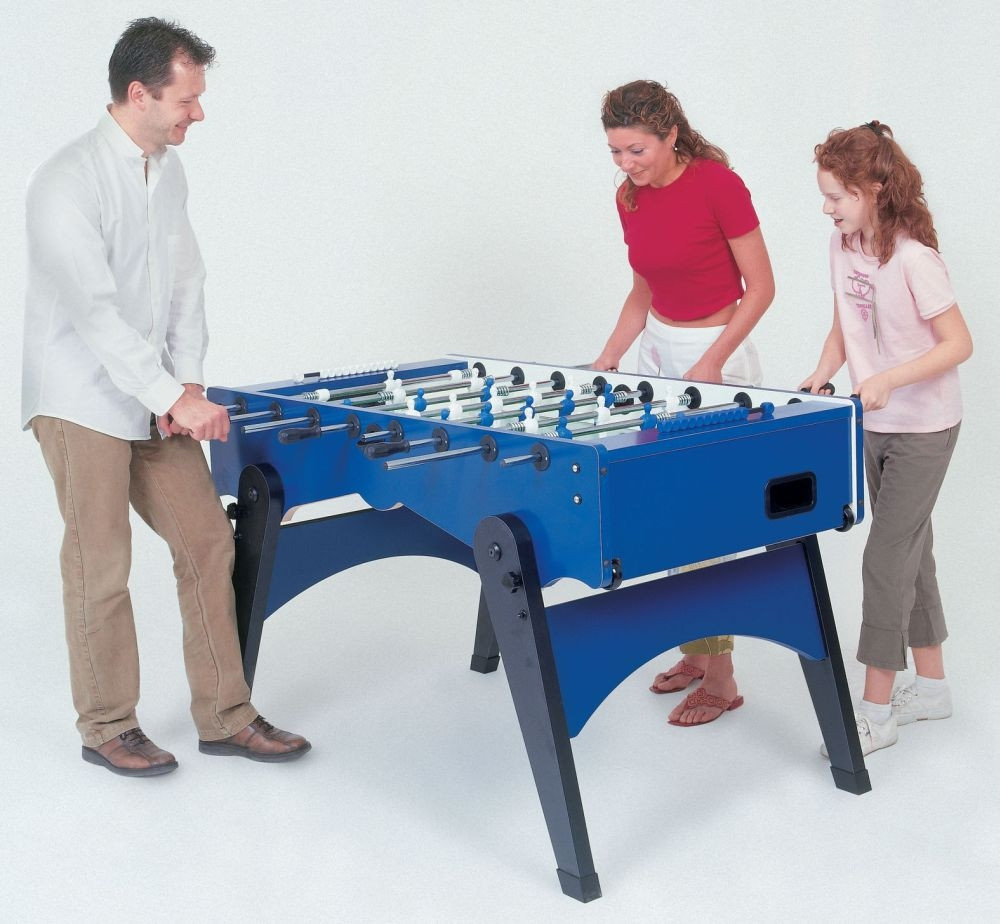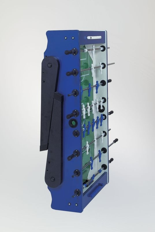 Garlando Foldy Fußballtisch mit zusammenklappbaren Beinen: Foldy Fußballtisch, welcher als sogar ein von seiner Marke ganz selbstständiges Modell erscheinen kann – das Äußere des Kickertisches ähnelt sich seinen Markenschwestern in nicht vielem, nicht einmal aber anderen Fußballtischen. Der Tisch hat ein innovatives, modernes Design. Seitens der Praxis ist er auch ideal: die Beine sind unter den Tisch einklappbar. Es gibt eine Alternative unter Hochniveau-Fußballtischen auch für Kunden, die mit Platzmangel kämpfen. Der Tischkorpus ist aus 25 mm dickem MDF-Material gefertigt, seine äußerste Schicht mit Melamin bedeckt, seine Farbe blau. Wenn nach Gebrauch die Beine des Tisches unter denselben eingeklappt werden, kann er in schräger Position auf seinen eigenen, im Gestell eingebauten Rollen gerollt sogar unter das Bett gelegt werden. Die Tischbeine haben eine Struktur aus 40 mm dickem MDF, ihre Oberfläche ist mit Melamin überzogen. Bereits zur Grundausführung des Kickertisches gehören 16 mm Durchmesser knackfeste Stahlstangen, deren Oberfläche mit korrosionsverhindernder Chromschicht überzogen ist. Die Kickervorrichtung kann nach Anspruch auch mit Teleskopstangen bestellt werden. Das Spielfeld ist mit sandgeblasenem Glas bedeckt, auf welchem der Ball sich mit besseren Eigenschaften bewegt als auf Spielfeldern mit laminierter Oberfläche. Die Kickerstangen laufen in Ringen mit Kugellagern, deren Vorhandensein das Spiel schneller macht, ohne dass das Handgelenk der Spieler angestrengt wird. Die Tischfußballvorrichtung wird mit 10 Stck. Standardbällen geliefert. Sie ist nach Anspruch mit 180- oder 360-Grad-drehenden Torwartfiguren zu bestellen. Die Spielfiguren sind weiß-blau. Es gilt 3 Jahre Garantie auf den Garlando Foldy Fußballtisch. Das Produkt entspricht den EU-Sicherheitsvorschriften EN 71-1, EN 71-2 und EN 71-3.