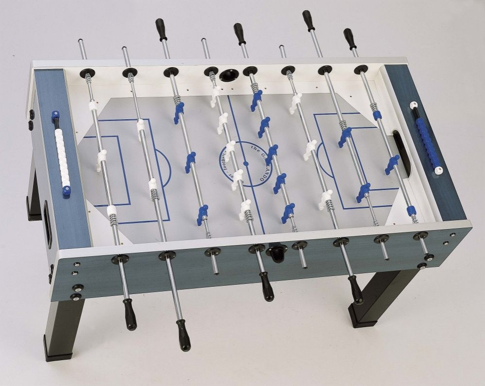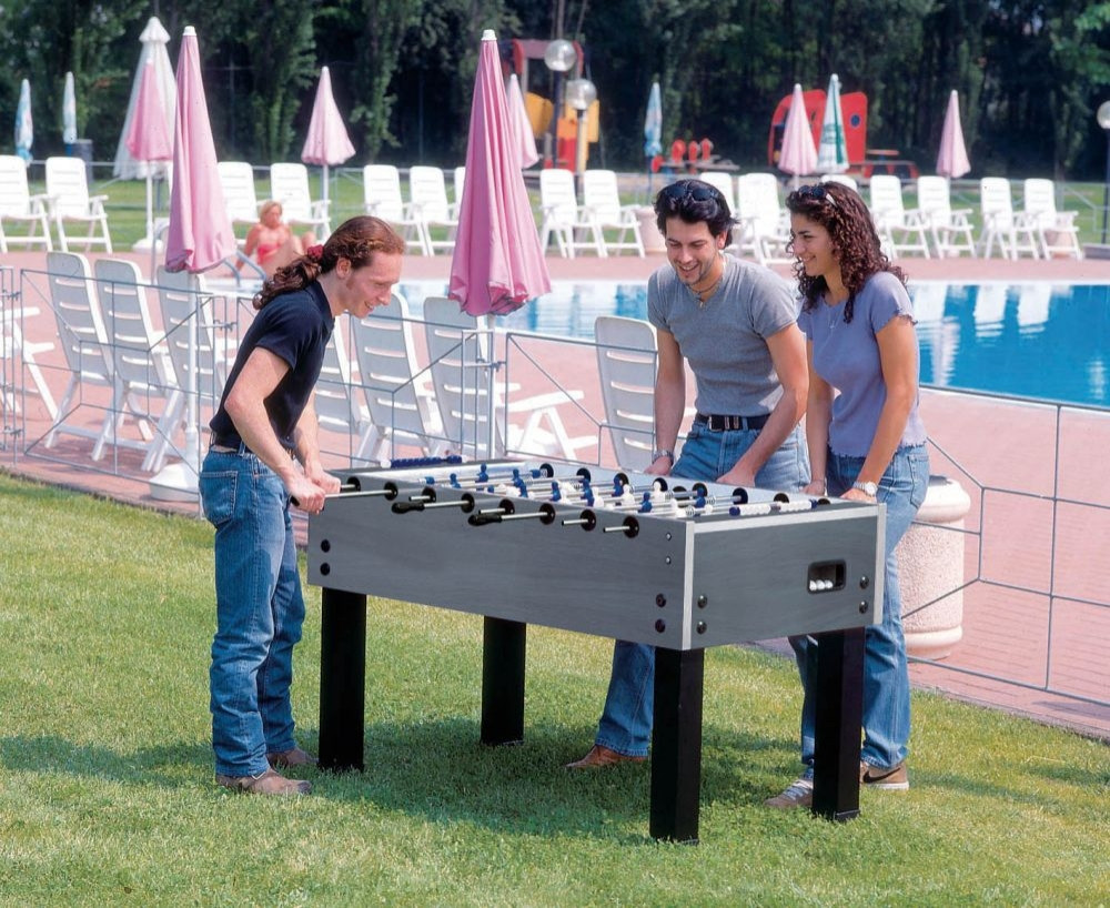 Garlando G-500W Fußballtisch für Außenverwendung mit Teleskopstangen – blau-silbern: Der wetterfeste Fußballtisch, der Garlando G-500W ist aus speziellen Materialien gebaut. Der Tisch widersteht allen Wetterumständen. Wir empfehlen den Kickertisch sowohl für freizeitliche Heimverwendung als auch für offene Gastgewerbestätten bis Campingplätze sowie Freibad-Geländen. Der 30 mm dicke Tischkorpus ist aus geschichtetem Holzmaterial (sog. Schiffholz) gefertigt, der seine äußere Bedeckung völlig aus einem Kunststoff hat. Die Tischstruktur ist ganz und gar wasserfest, auch die Klebeflächen sind durch die Anwendung von wetterfestem Klebstoff konstruiert. Der Spieltisch ist mit rotem bzw. blauem Bezug (das zweite in Holzmuster) bestellbar. Die Tischbeine sind aus 9 x 9 cm dickem viereckigem Stahl gefertigt, der Anstrich an ihrer Oberfläche ist speziell, besonders abplatzfest. Die Stangen sind aus Stahl mit 16 mm Durchmesser gefertigt, ihre Oberfläche wird im Vergleich zu Innengeräten in dreifacher Dicke mit einer korrosionsfesten Schutzschicht aus Chrom überzogen. Das Spielfeld ist mit laminierter Oberfläche bedeckt und durch wetterfesten Klebstoff fixiert. Die Markierungslinien des Spielfeldes sind mit speziellem ausbleichfestem Anstrich gemalt. Die Kickerstangen laufen in Ringen mit Kugellagern, deren Vorhandensein das Spiel schneller macht, ohne dass das Handgelenk der Spieler angestrengt wird. Die Spielfiguren sind weiß-blau zum blauen Spieltisch, der rote Tisch hat aber gelb-rote Figuren. Die Tischfußballvorrichtung wird mit 10 Stck. Standardbällen geliefert. Sie ist nach Anspruch mit 180- oder 360-Grad-drehenden Torwartfiguren zu bestellen. Es gilt 3 Jahre Garantie auf den Garlando G-500W Fußballtisch. Der Tischkorpus ist mit UV-resistenter Lackierung überzogen, die einen sogar in langer Zeit nicht bleichenden Farbton zum Vorteil hat. Zur Grundausführung des Kickertisches gehört eine wetterfeste Staubschutzplane. Das Produkt entspricht den EU-Sicherheitsvorschriften EN 71-1, EN 71-2 und EN 71-3. Nehmen Sie vor einem Kickertischkauf die Wahl dieses ausgezeichneten Qualitätskickers in Rücksicht! Garlando offener Fußballtisch für Außenverwendung Für Heimverwendung Ohne Münzprüfer In Rot sowie in Blau bestellbar Der Outdoor-Kicker widersteht allen Wetterumständen: die Stahlelemente sind gegen Verrostung behandelt – er kann als Outdoor-Spielgerät für Körperschaften, Schulen, Kindergärten eine perfekte Wahl sein. Wir empfehlen ihn für Freibad-Geländen und Campingplätze. 3-schichtiges MDF-Material mit laminierter Oberfläche, Klebeflächen mit wasserfestem Klebstoff; in Hinsicht auf die Normalgröße des Produkts ist es auch für Innenverwendung vortrefflich geeignet. 3 Jahre Garantie UV-resistent, seine Farbe bleicht nicht einmal bei nachhaltiger Verwendung aus. Torwartfiguren in 360- oder 180-Grad-drehender Ausführung wählbar Sowohl mit Teleskopstangen als auch mit durchgehenden Stangen bestellbar. Eine Wetterschutzplane gehört zum Produkt!