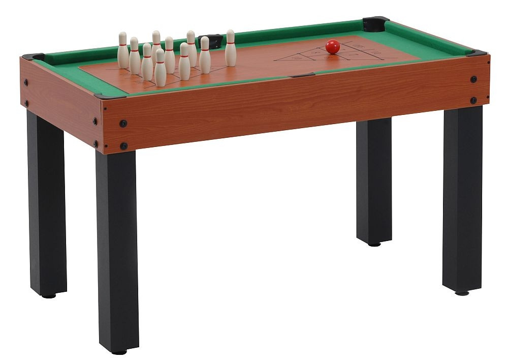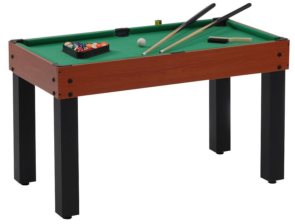 Vielseitiger Multifunktionstisch, der für nicht weniger als 12 Tischspiele (mit Bällen) geeignet ist: Tischfußball, Billard, Tischtennis, Airhockey, Bowling, Shuffleboard, Backgammon, Black Jack, Schach, Dame, Würfelspiel und Kartenspiel. 15 mm dicke Tischplatten aus MDF, mit einer Deckschicht aus Melamin (Kunstharz) an den Seiten. In Kirschfarbe. Starke, viereckige Beine (7,5 x 7,5 cm) für maximale Sicherheit, mit schwarzer Melamin-Deckschicht. Standardmäßige Höheneinsteller zur Gestaltung eines vollkommen waagerechten Spielfeldes. Der Multi-12 in Tischfußball-Funktion: Spieloberfläche aus MDF, überzogen mit Melamin 13 mm Durchmesser Stangen (Dicke von 1 mm) Völlig umdrehende Torwart-Spielfiguren, 2 Verteidiger-, 5 Mittelfeldspieler-Figuren, 3 Stürmer-Figuren Hinter den Toren gibt es Netzbeutel, die den Ball im Fall eines Goals auffangen. 2 schwarz-weiße Bälle sind Zubehör Der Multi-12 in Billard-Funktion: Spieloberfläche aus MDF, mit klassischem grünem Textilmaterial überzogen Gepolsterte L-förmige Ränder für einen genaueren Rückprall des Balles Netztaschen, aus denen der Ball mit der Hand auszunehmen ist Ergänzendes Zubehör: 2 Holzqueues, 1 Set 38 mm Durchmesser Billardkugeln, 1 Stck. Billardkreide, 1 Billardtischbürste Der Multi-12 in sonstigen Funktionen: Tischtenniszubehör: Netz, Kanten, 2 Schläger, 2 Bälle Airhockeyzubehör: 2 Pusher, 2 Pucks In den anderen Spielfunktionen ist auch alles relevante Zubehör vorhanden. Größen des Multi-12 Tisches: Länge: 108 cm Breite: 61 cm Höhe: 81 cm (Fußballtisch)/66 cm (Billard) Gewicht: 35 kg
