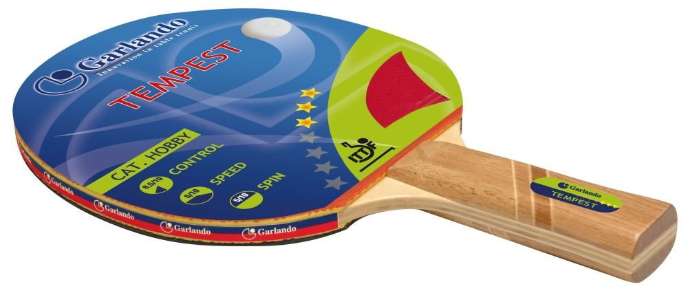 Garlando Tempest Hobby-Tischtennisschläger: 5,5 mm dickes Schlägerholz 1,8 mm dicker Schwamm Softbelag (ITTF-Code: "807") Geschwindigkeit: 6 Haftung: 5 Wahrnehmung: 8,5