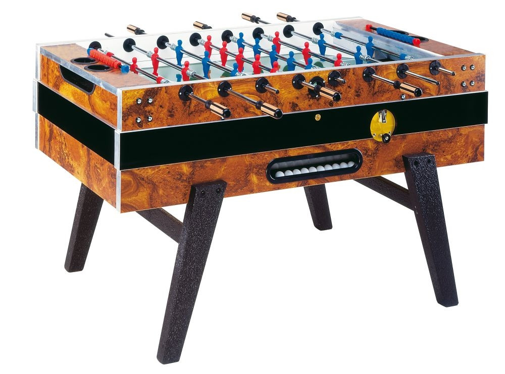 Garlando Deluxe Münzprüfer-Fußballtisch mit Teleskopstangen: Der Tisch wird in zwei Ausstattungen gefertigt. Der Deluxe Italia/Svizzera ist ein kürzerer Tisch, der nicht herumdrehende Torwartfiguren hat; sein dunkler grafitgrauer Korpus hat hellgraue Einlage. Das Modell Deluxe Export ist die längere Ausführung. Ihre Farbe ist das traditionelle braune Holzmuster, die Torwartfiguren sind herumdrehend. Der Tischkorpus ist aus 30-36 mm dickem geschichtetem Fichtenholz gefertigt, das mit einer laminierten Schicht überzogen ist. Die schrägen Tischbeine sind aus Hartholz hergestellt und mit waschfestem Anstrich behandelt. Die 16 mm Durchmesser Stangen sind 2,3 mm dick, aus kaltgerolltem Stahl (25NC6), der hohe Zugfestigkeit (R = 100 kg x mm2) hat und mit 15 Mikron dickem Chrombezug versehen ist. Die (blauen bzw. roten) Spielfiguren sind einfarbig. Das Spielfeld ist 5 mm dickes Sandglas mit gehärteter Oberfläche. Es gehören Aschenschalen zum Kickertisch, deren Entleerung durch Ausheben erledigbar ist. Zwischen den Aschenschalen gibt es je 2 Becherhalter an beiden Seiten. Die mit Holz eingelegten Kickergriffe aus Plastik haben einen großen Durchmesser, sind komfortabel und nehmen den Schweiß auf. Das Münzprüfsystem kann zu allerlei Geld- oder standardmäßigen Münzen optimiert werden, oder auch ausgeschaltet werden. In der Grundausstattung ist der Kickertisch mit dem bewährten mechanischen Münzprüfsystem ausgestattet, zur Befriedigung von extra Ansprüchen sind auch elektromechanische bzw. Garlando 2001 elektronische Münzprüfsysteme verfügbar. Der Kicker wird mit 10 Stck. weißen Standardbällen geliefert.