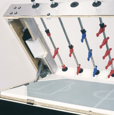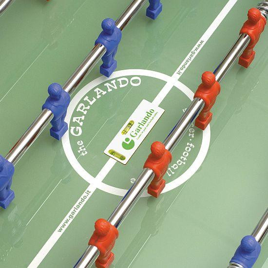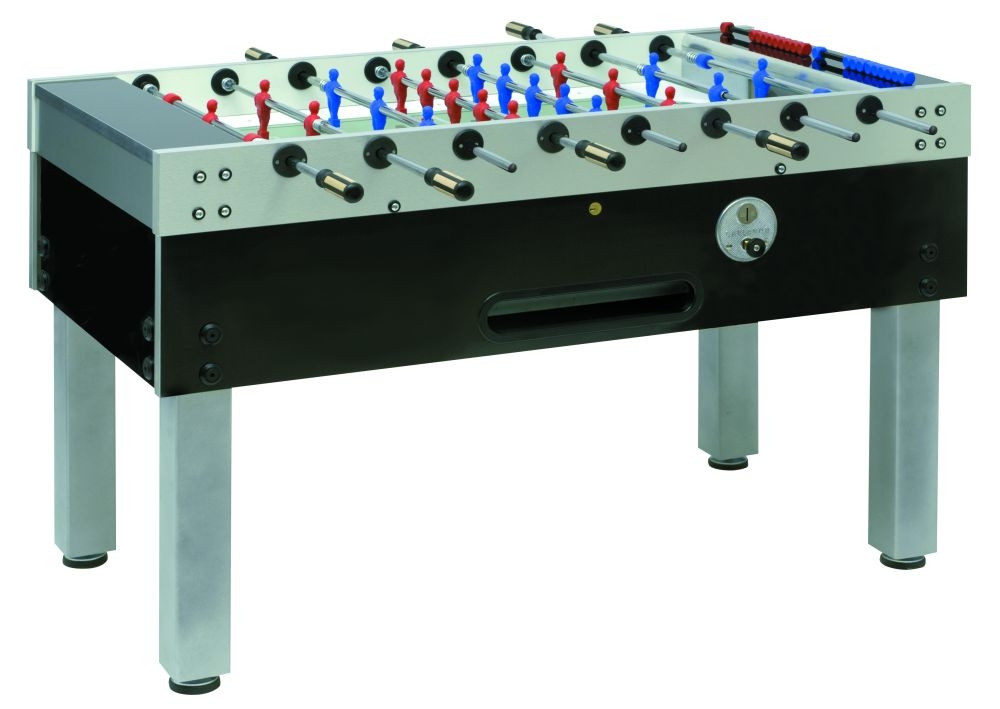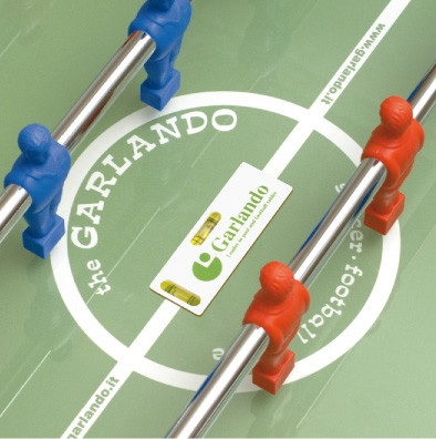 Garlando Tournament Münzprüfer-Fußballtisch mit Teleskopstangen: Die Zwillingsschwester des World Champion Kickers, mit nicht herumdrehenden Torwartfiguren. Dieser Fußballtisch hat die Bestimmung, die Erfolge des World Champion Modells fortzusetzen; alle seine Eigenschaften sind mit denen des anderen übereinstimmend. Der Hersteller, der aus Wettkampferfahrungen schöpfen kann, hat die Entwicklung eines Kickertisches mit einer Stabilität über alles bisherige erstrebt. Die Struktur der Platten ist nicht steif, während der Tisch sich als äußerst stabil erweist. Seine laminierte Oberfläche hat eine lackschwarz-graue Lackierung, mit Kantenschutz aus Aluminium. Die Tischbeine sind aus 9 x 9 cm dickem viereckigem Stahl gefertigt, und sie haben neuartige Höhenversteller. Dank diesen Eigenschaften und den Griffen mit Holzeinlage scheidet sich der Tisch von den anderen. Er ist ausschließlich mit nicht herumdrehenden (180-Grad-drehenden) Torwartfiguren bestellbar. Die (blauen bzw. roten) Spielfiguren sind einfarbig. Das Spielfeld ist 5 mm dickes gehärtetes Sandglas mit spiegelfreier Oberfläche. Das Material der Tore ist eine Legierung aus Aluminium und Zink für eine längere Lebensdauer – dazu kommt ein schalldämpfender Toreinsatz. Das Spielfeld hat neuartige Eckelemente zur Beseitigung eines toten Bereichs, die die Bälle ohne Treppen auf das Feld zurückleiten. Das Münzprüfsystem kann zu allerlei Geld- oder standardmäßigen Münzen optimiert werden, oder auch ausgeschaltet werden. In der Grundausstattung ist der Kickertisch mit dem bewährten mechanischen Münzprüfsystem ausgestattet, zur Befriedigung von extra Ansprüchen sind auch elektromechanische bzw. Garlando 2001 elektronische Münzprüfsysteme verfügbar. Der Kicker wird mit 10 Stck. Standardbällen geliefert.