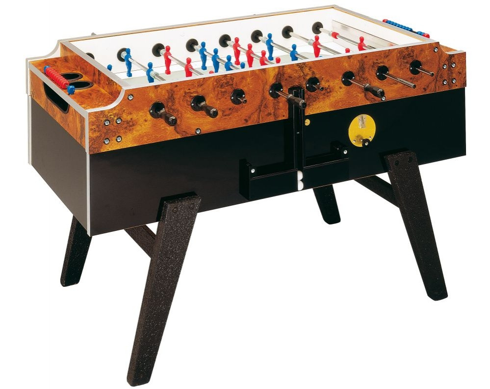 Garlando Olympic Barfußballtisch mit Münzprüfer: Das häufigste Sportgerät von Bars, Cafés. Es ist der Garlando Olympic Tischkicker, den die entscheidende Mehrheit der Gastgewerbestätten in Ungarn hat, wo es ein Fußballtisch betätigt wird. Die Garlando Kicker bieten mit den Produkten anderer Hersteller verglichen ein wesentlich besseres Spielerlebnis – und die Betreiber der Lokale wissen darüber Bescheid. Der Tischkorpus ist aus 30 mm dickem geschichtetem Fichtenholz gefertigt, das mit einer laminierten Schicht überzogen ist. Die schrägen Tischbeine sind aus Hartholz hergestellt und mit waschfestem Anstrich behandelt. Die 16 mm Durchmesser Stangen sind 2,3 mm dick, aus kaltgerolltem Stahl (25NC6), der hohe Zugfestigkeit (R = 100 kg x mm2) hat und mit 15 Mikron dickem Chrombezug versehen ist. Die Spielfiguren sind einfarbig (blau bzw. rot). Spieler, die die Sicherheit im Sinne haben, können den Tisch auch mit Teleskopstangen wählen. Die Spielfeldoberfläche ist 5 mm dickes gehärtetes Sandglas. Es gehören Aschenschalen zum Kickertisch, deren Entleerung durch Ausheben erledigbar ist. Zwischen den Aschenschalen gibt es je 2 Becherhalter an beiden Seiten. Die Stangen, die in Ringen mit Kugellagern laufen, begünstigen ein schnelleres Spiel ohne Belastung des Handgelenks. Der Tisch ist durch einen Deckel aus Sicherheitsglas bedeckt: das verhütet, dass Bälle verloren gehen, isoliert die Geräusche, und das Spielfeld kann rein gehalten werden. Er ist empfohlen an solche Stellen, wo es keine ständige Kontrolle gibt. Wenn man das Oberteil des Tisches zur Entleerung des Münzbehälters aufhebt, braucht man es nicht von Hand zu halten: Gasfedern an beiden Seiten helfen, es zu stützen. In der Grundausstattung gehört keine Beleuchtung zum Tisch; nach Anspruch ist eine LED-Stadionbeleuchtung zu 110 V oder 220 V Spannung bestellbar. Das Münzprüfsystem kann zu allerlei Geld- oder standardmäßigen Münzen optimiert werden, oder auch ausgeschaltet werden. In der Grundausstattung ist der Kickertisch mit dem bewährten mechanischen Münzprüfsystem ausgestattet, zur Befriedigung von extra Ansprüchen sind auch elektromechanische bzw. Garlando 2001 elektronische Münzprüfsysteme verfügbar. Der Kicker wird mit 10 Stck. Standardbällen geliefert.