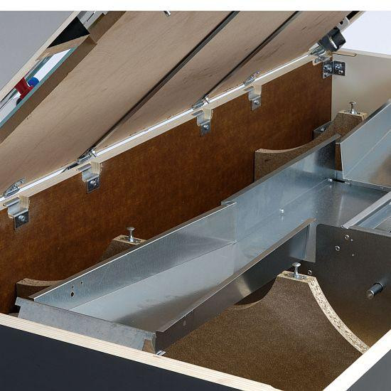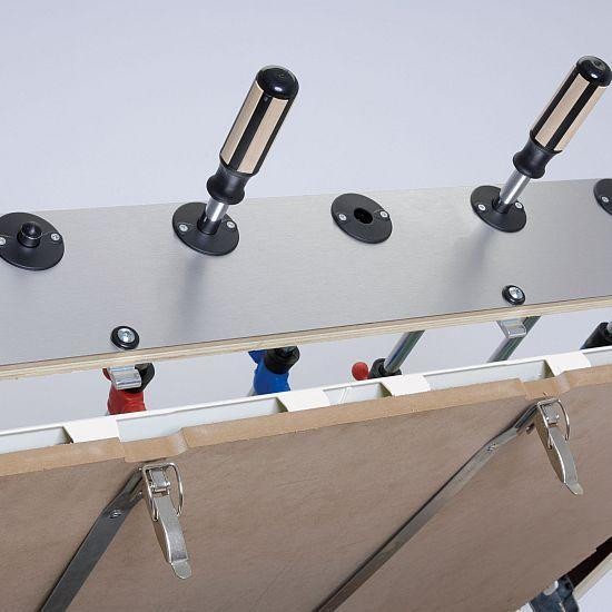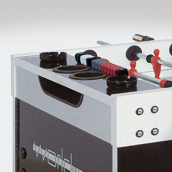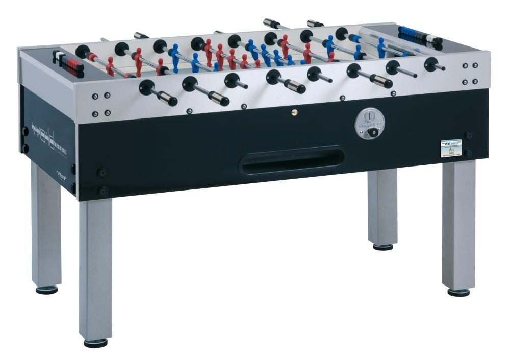 Garlando World Champion ITSF-Wettkampf-Kicker: Das World Champion Modell wurde vollständig den Ansprüchen der professionellen Wettkämpfer entsprechend, ihre Ratschläge beachtend gestaltet. Der Tisch ist aus 3 cm dicker geschichteter Fichtenholzplatte und aus mitteldichtem Holzfaserstoff gebaut. Diese Kombination sichert – neben der größten Stabilität des Tisches – die größte mögliche Flexibilität. Farbe: lackschwarz, mit ITSF-Logo. Das Spielfeld ist für offizielle Wettkämpfe geeignet, was in einem Zertifikat festgestellt wird. Zu jedem Tisch gehört ein einzeln nummeriertes Zertifikat. Durch die Verstellung zweier eingebauten Halter kann man die vollkommen waagerechte Lage des Spielfeldes erreichen. Beim Öffnen des Tisches springt eine Halterstange automatisch hervor – man braucht das Oberteil nicht mit eigener Hand zu halten. Das Spielfeld ist aus spiegelfreiem wärmebehandeltem Sandglas, und es hat neue Plastikteile an den Rändern, damit es keinen toten Bereich gibt und das Spiel vergnüglich laufen kann. Die neuen Plastikteile berühren die Spielfeldoberfläche völlig treppenfrei. Die Tore werden aus HDP (einem Polymer hoher Resistenz) mit Glasfaserverstärkung gefertigt. Die 3 mm dicken knackfesten Stahlstangen mit 16 mm Durchmesser sind mit korrosionshinderndem Chrombezug gefertigt: im Vergleich zu normalen knackfesten Stangen haben diese eine um 50% größere Torsionshärte und sie krümmen sich nicht einmal nach zahllosen Verwendungen. Die Dämpfer an den Stangen sind neuartig, gefertigt aus 19 mm langem Gummi mit besserer Schwingungsdämpfung. Auf der Stange der Torwartfigur gibt es zusätzliche Plastik-Distanzhalter. Die Stangen, die in Ringen mit Kugellagern laufen, begünstigen ein schnelleres Spiel ohne Belastung des Handgelenks. Die Spielfiguren sind blau-rot, ihre Beine haben eine gerundete Oberfläche; die Torwartfiguren haben eine 360-Grad-drehende Ausführung. Plastikgriffe mit Holzeinlage gehören zum Kicker. Der Trefferzähler ist eine Wettkampfausführung: er ist für Zählen der Siege sowie der Treffer gemeint. Die Kickerbeine, aus 9 x 9 cm dickem viereckigem Stahl gestaltet, sind mit grauem abplatzfestem Anstrich behandelt. Wettkampf-Höheneinsteller sind am Unterteil der Beine montiert. Das Münzprüfsystem kann zu allerlei Geld- oder standardmäßigen Münzen optimiert werden, oder auch ausgeschaltet werden. In der Grundausstattung ist der Kickertisch mit dem bewährten mechanischen Münzprüfsystem ausgestattet, zur Befriedigung von extra Ansprüchen sind auch elektromechanische bzw. Garlando 2001 elektronische Münzprüfsysteme verfügbar.
