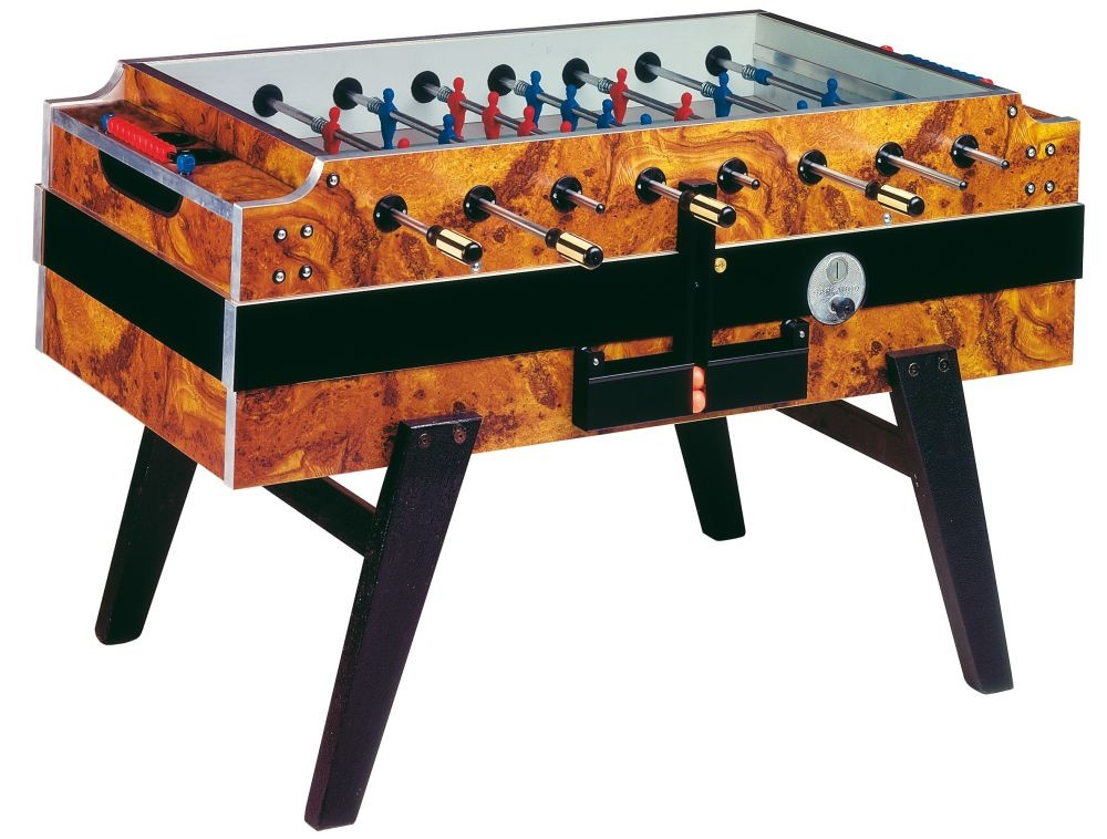 Garlando Coperto Münzprüfer-Fußballtisch mit Teleskopstangen, mit LED-Beleuchtung: Der Tisch wird in zwei Ausstattungen gefertigt. Der Coperto "Standard" ist in traditioneller Kombination von Braunholz- und lackschwarzer Farbe, das Modell Coperto "Competition" jedoch ist in rot-weiß-blauer Farbenzusammensetzung gestaltet. Der Tischkorpus ist aus 30-36 mm dickem geschichtetem Fichtenholz gefertigt, das mit einer laminierten Schicht überzogen ist. Die schrägen Tischbeine sind aus Hartholz hergestellt und mit waschfestem Anstrich behandelt. Die 16 mm Durchmesser Stangen sind 2,3 mm dick, aus kaltgerolltem Stahl (25NC6), der hohe Zugfestigkeit (R = 100 kg x mm2) hat und mit 15 Mikron dickem Chrombezug versehen ist. Die (blauen bzw. roten) Spielfiguren sind einfarbig. Das Spielfeld ist 5 mm dickes Sandglas mit gehärteter Oberfläche. Es gehören Aschenschalen zum Kickertisch, deren Entleerung durch Ausheben erledigbar ist. Zwischen den Aschenschalen gibt es je 2 Becherhalter an beiden Seiten. Die mit Holz eingelegten Kickergriffe aus Plastik haben einen großen Durchmesser, sind komfortabel und nehmen den Schweiß auf. Die Stangen, die in Ringen mit Kugellagern laufen, begünstigen ein schnelleres Spiel ohne Belastung des Handgelenks. Der Tisch ist durch einen Deckel aus Sicherheitsglas bedeckt: das verhütet, dass Bälle verloren gehen, isoliert die Geräusche, und das Spielfeld kann rein gehalten werden. Er ist empfohlen an solche Stellen, wo es keine ständige Kontrolle gibt. Wenn man das Oberteil des Tisches zur Entleerung des Münzbehälters aufhebt, braucht man es nicht von Hand zu halten: Gasfedern an beiden Seiten helfen, es zu stützen. LED-Stadionbeleuchtung zu 110 V oder 220 V Spannung. Das Münzprüfsystem kann zu allerlei Geld- oder standardmäßigen Münzen optimiert werden, oder auch ausgeschaltet werden. In der Grundausstattung ist der Kickertisch mit dem bewährten mechanischen Münzprüfsystem ausgestattet, zur Befriedigung von extra Ansprüchen sind auch elektromechanische bzw. Garlando 2001 elektronische Münzprüfsysteme verfügbar. Der Kicker wird mit 10 Stck. orangen Standardbällen geliefert.